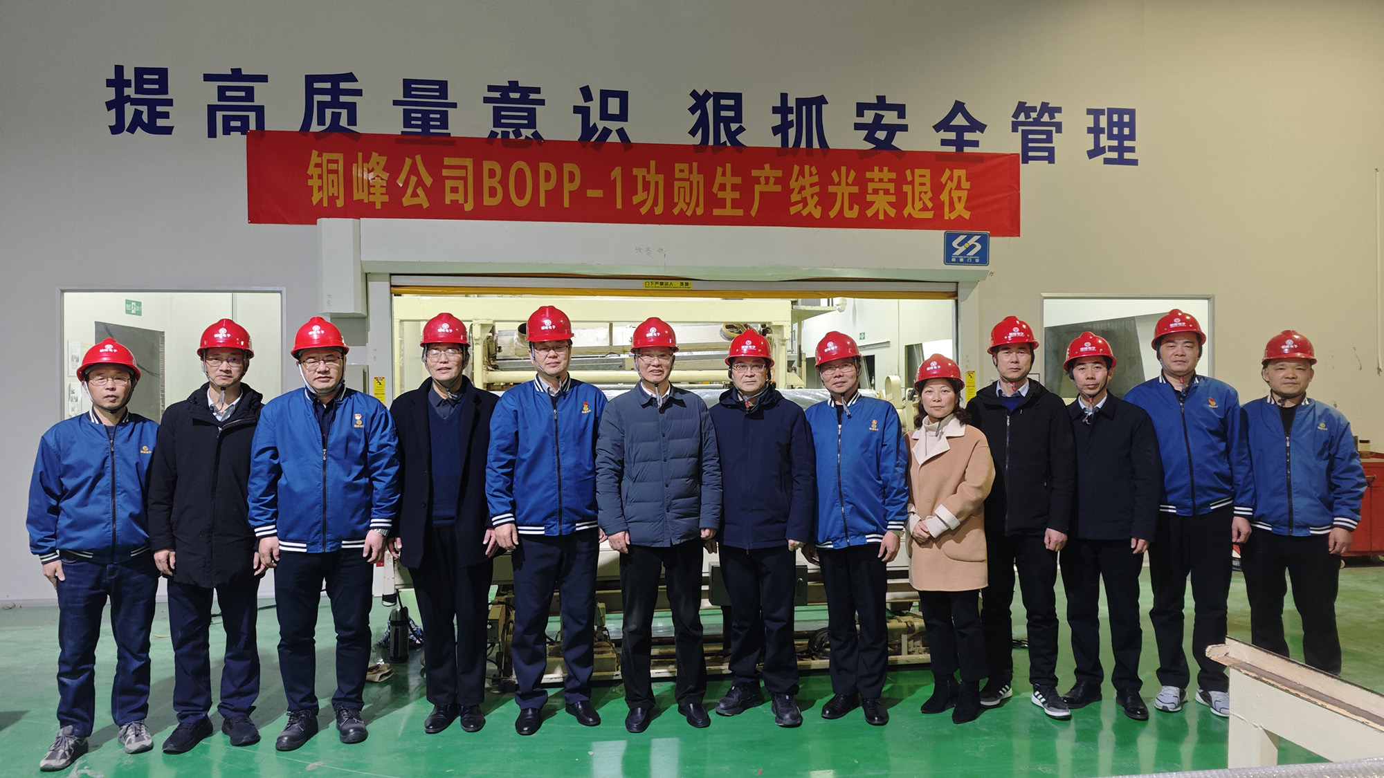 圖為公司黨政領(lǐng)導(dǎo)班子和電容薄膜分公司管理人員與BOPP-1功勛線合影留念